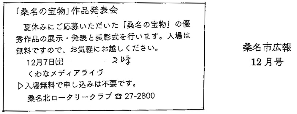 しかし、積極的に係った小中学生にとっては良い勉強のチャンスを提供できたと自負しています。ロータリアンにとっても事業を企画・遂行することを学ぶ機会だったし、小中学生の作品を通して地域を知ることも出来、貴重な体験でした。