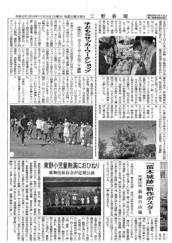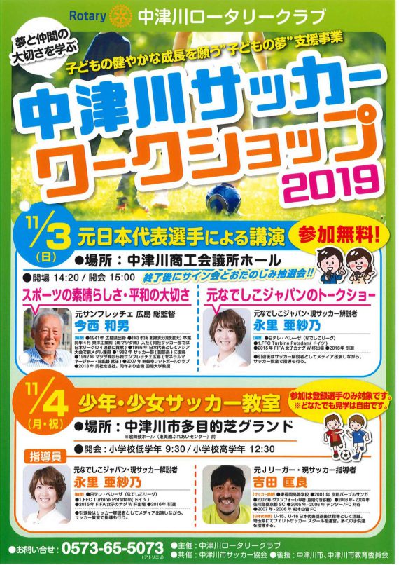 今期のロータリー財団地区補助金事業の「子どもの健やかな成長を願う“子どもの夢”支援事業」第1弾として、2019年11月3日に中津川商工会議所ホールにおいて、元サンフレッチェ広島総監督の今西和男先生と元なでしこジャパンの永里亜紗乃さんによる講演会を開催しました。参加した子ども達は、お二人の子どもの頃のお話しを聞くことによって、「夢」「仲間の大切さ」を学びました。そして、翌4日に中津川市多目的芝グランドにおいて、少年サッカー教室を中津川市サッカー協会支援のもと開催しました。永里亜紗乃さんの技術指導を受けることによって、少年達のサッカー技術を向上させ、夢の実現に近づけたものと思います。両日とも天候に恵まれ各々200名以上の子ども達や父兄に参加していただき、大いに盛り上がりました。