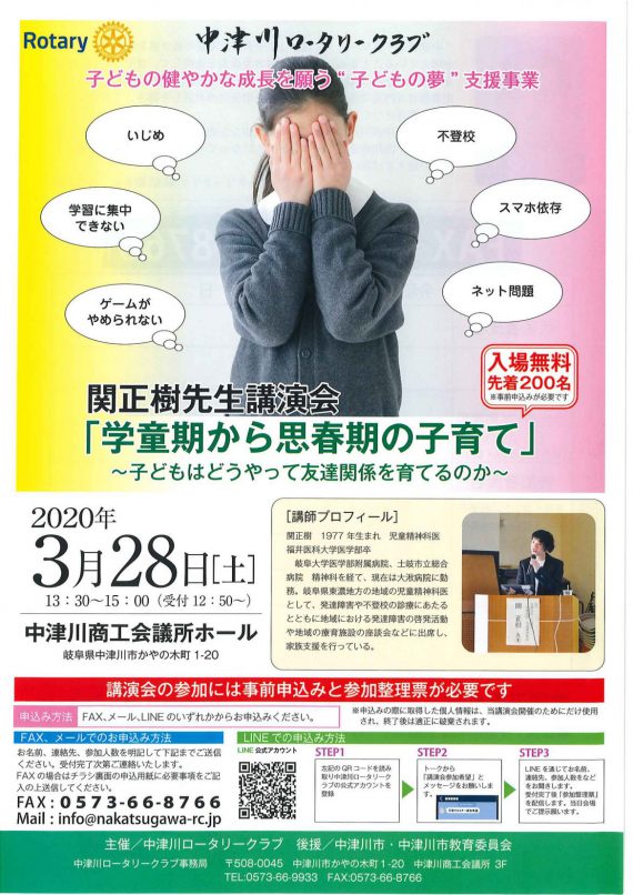 そして、第2弾として、今年3月28日に中津川商工会議所ホールにおいて、若い父親・母親を対象にした「学童期から思春期の子育て」と題する講演会を大湫病院の児童精神科医の関正樹先生にお願いして企画したところ、募集してから1週間で定員200名の席がすぐに埋まり、さらに240名まで席を増やしましたが、まだキャンセル待ちが10名いるという状況でありました。前評判の高い講演会として私たちロータリアンは気合いが入っていましたが、新型コロナウィルス感染拡大防止により講演会の中止を決めました。