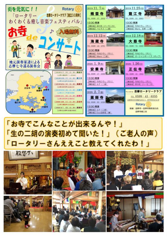 2019年11月7日より2020年2月7日に亘り、7ヵ寺を演奏家、当クラブの会員がまわり、地元在住の老若男女およそ600名に心癒される音楽を聴いていただくことができました。新型コロナウイルス感染症の影響を受ける前に終了することができ、会員も一番の喜びでした。