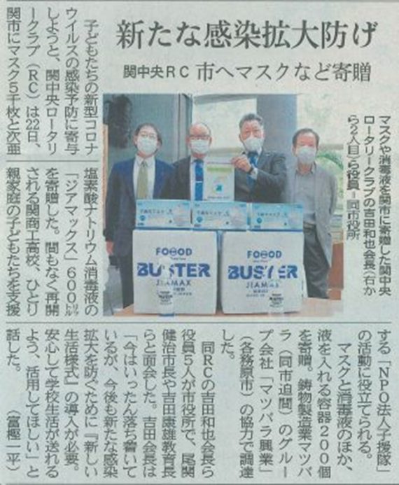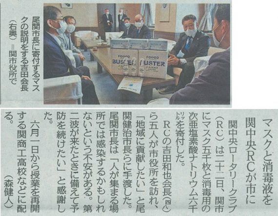 関中央ロータリークラブは、永年に渡り 森林整備や河川清掃ボランティア・海外との交換学生事業を行い、下は幼稚園から上は高校生まで幅広く人材育成や基本的教育の向上に努めて来ました。 今日、新型コロナウイルスによる緊急事態宣言により、全国的に学業・教育の現場では、感染予防の対応に苦慮しています。 そんな中、当クラブで支援できることはないかと考えた時、やはり学生たちの新型コロナウイルス感染予防・健康維持のための支援が必要と考えました。 関市にマスクと消毒液を寄付し、関商工高等学校の学生やひとり親家庭で貧困など生活困難を抱える家庭の子どもたちの支援をすることが良いと考え、マスクと消毒液の寄付事業をしたいと思いました。 詳細について、関市役所と打ち合わせを行い、学生支援をしました。